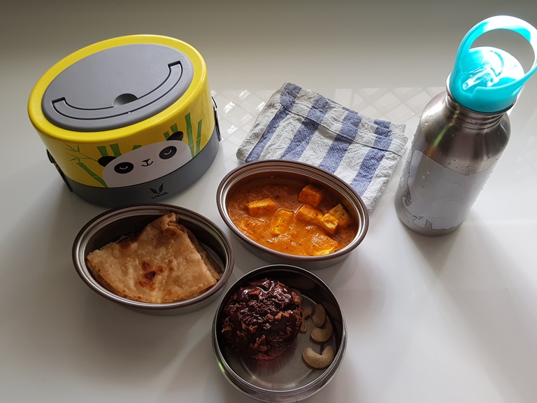 Maha’s lunch box today is chapati with ghee on top and 10 min paneer butter masala.