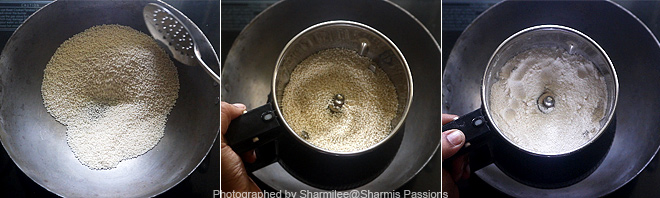 - Dry roast the millet for 5 mins in low flame.Cool down, transfer to mixer jar and grind to a fine powder,Set aside.