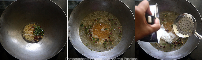 - Heat oil in a kadai add the items listed under ‘to temper’, then add water.Let it boil, when it boils add the powder and stir simultaneously.