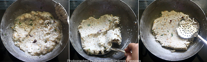 - Keep stirring, if lumps form press with ladle and break it.Cook until it is nonsticky and comes together.Switch off.