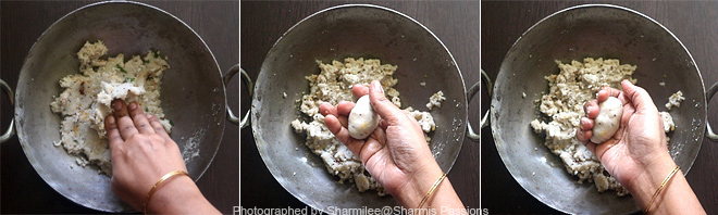 - When its warm , handle with hands, mix well.Pinch a small portion of the dough, grease your hand with ghee. shape into a cylinder.