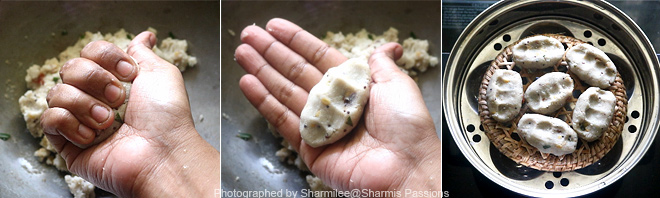 - Press with fingers to form impression as shown.Prepare the steamer and keep it ready.Arrange the kozhukattais.