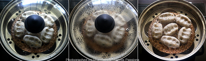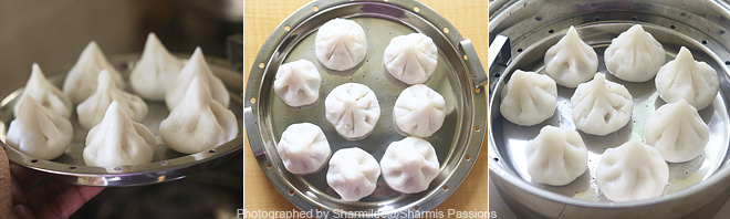- Steam for 5 – 7 minutes. I used my idli pot and placed the modak in bamboo steamer. You can use idli plates too. Just grease it and place the modaks. Repeat to finish.
