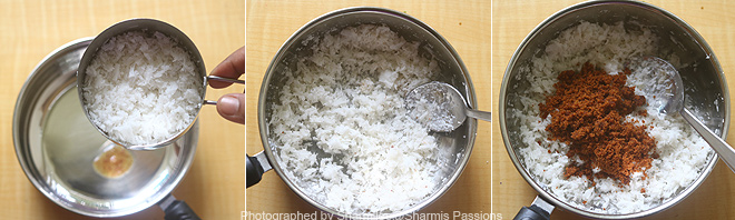 - Heat ghee in a pan add coconut, saute for few mins then add jaggery powder to it.