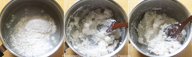 - Mix well and cook until all rice flour is mixed with water.Switch off and remove pan from stove.