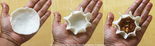 - Flatten it and make it like a cup.Pinch the edges as shown.Add the preparing stuffing inside.