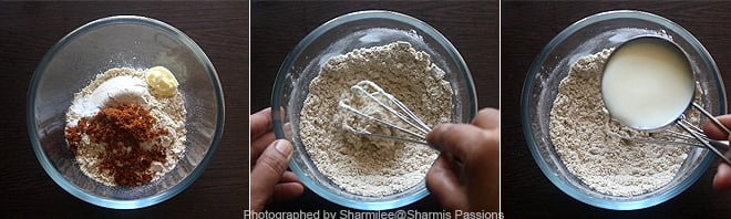 - To a mixing bowl add wheat flour,health mix,cane sugar,butter,salt,baking soda.Mix this well first then add milk to it.