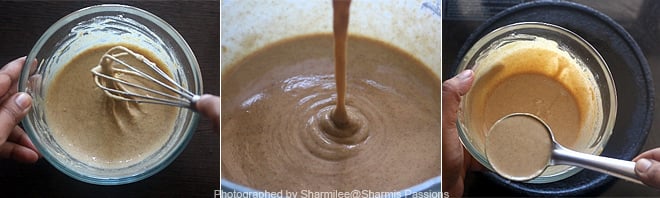 - Add water and whisk well without any lumps.The batter should be creamy and flowing without any lumps.Heat dosa tawa, spread butter over the tawa.Take a ladle full of batter.