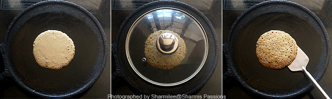 - Pour on the preheated dosa tawa, do not spread.Cook covered for 2 mins in low medium.