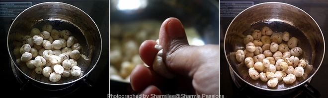- Heat ghee, add makhana and roast till its golden and crisp.Break to check if its crispy.Set aside.