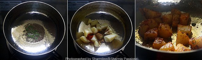 - Heat oil – add jeera,green chillies let it splutter then add boiled potatoes along with chilli, anarthana and roasted jeera powder and salt.Mix well and roast for a minute.
