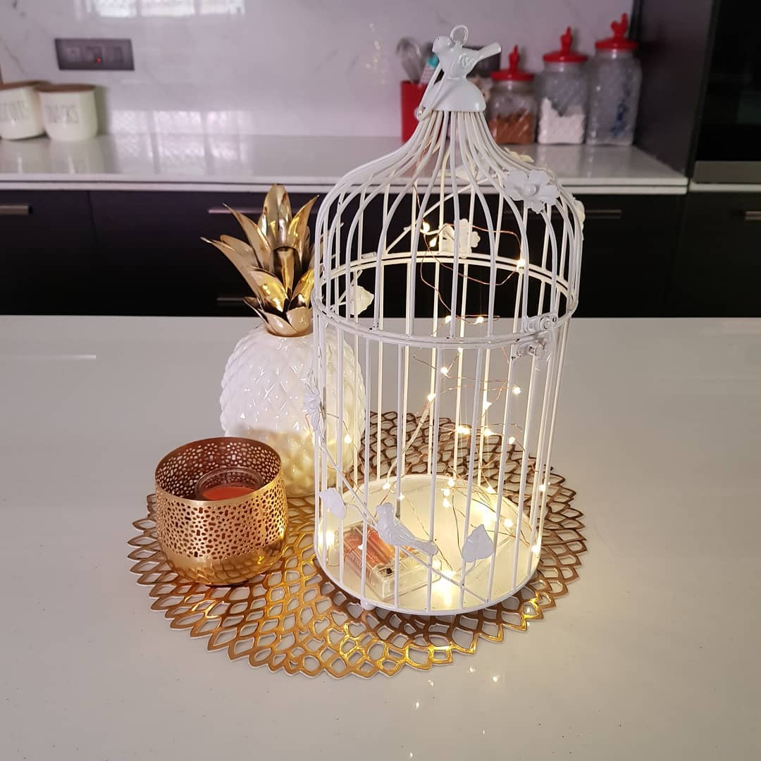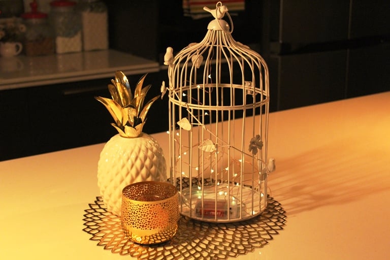 This is how i deocrated the island. I placed a bird cage, pineapple, candle holder on a gold place mat. This is how it looks when lights are off.