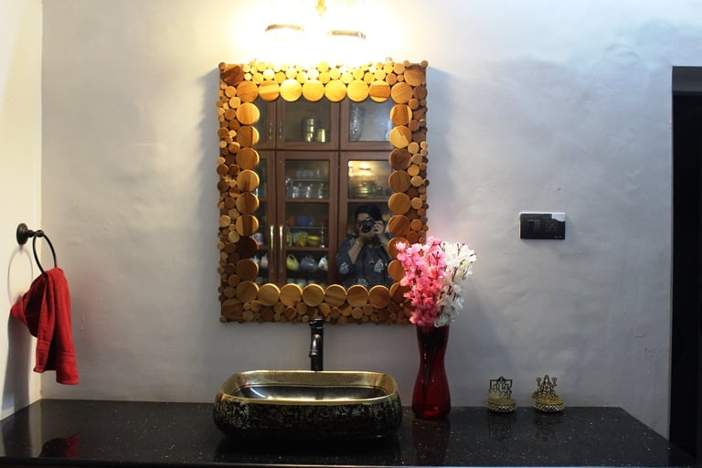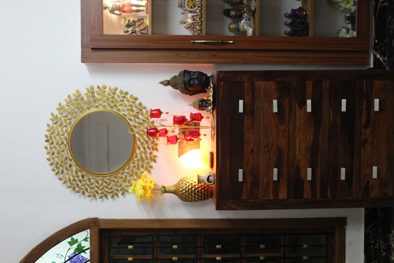The red hanging t light holder is from homecenter. And the mirror is from amazon. I have added all links below. I placed two buddha face, a red hanging t light holder and a gold vase. I have my all time favorite himalayan pink salt lamp and my essential oil diffuser.