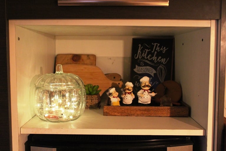 I placed a good old pumpkin jar with some string lights. Other things are collected over the years.
