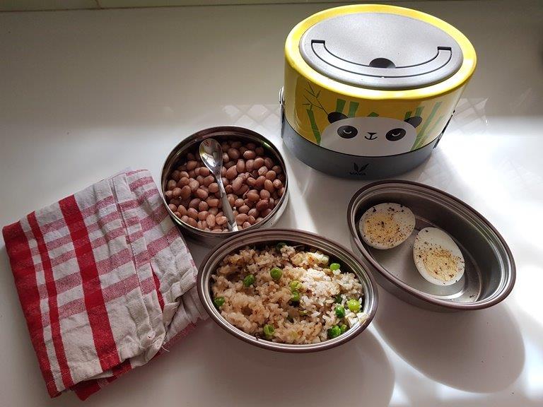 Peas pulao and boiled eggs in her lunch box. Boiled peanuts on her snacks box.