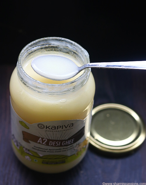 The ghee is white in color, its made from curd not malai, tastes soo good.I am happy both the kids love the ghee taste.I used this Kapiva ghee to prepare this cashew pulao and it turned out soo good.