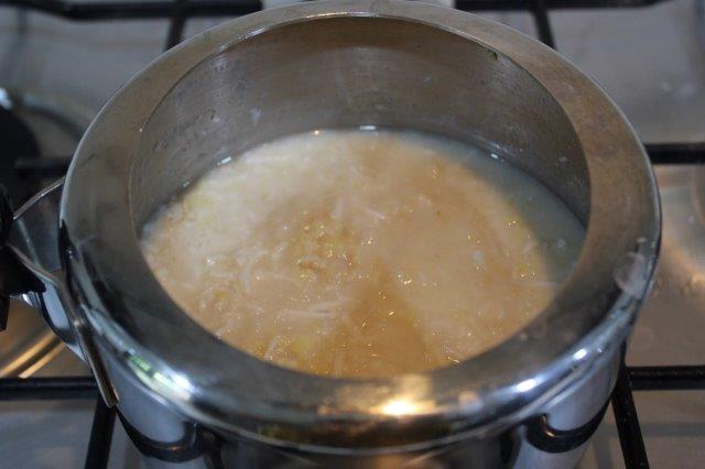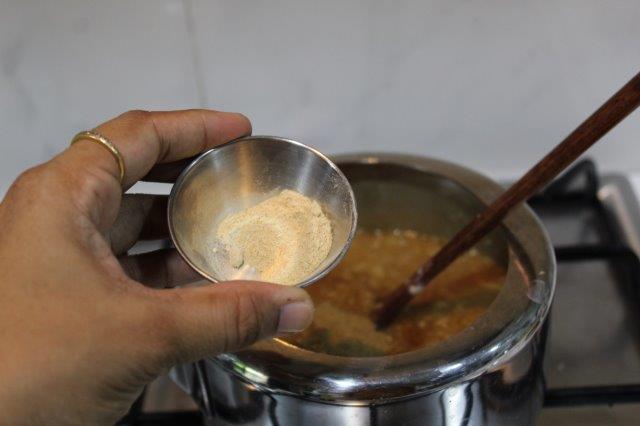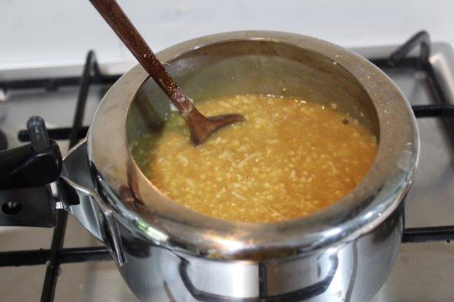 - Now open the cooker, add in jaggery syrup and cook till it thickens.