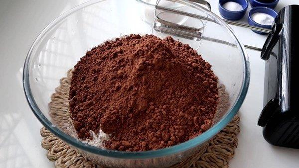 - Make cake batter. Take sugar, flour, cocoa, baking soda, baking powder, salt in a bowl and mix well.