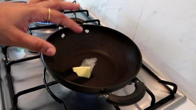 - Now take ½ of the butter in a pan, add in half of the semiya and flatten it well.