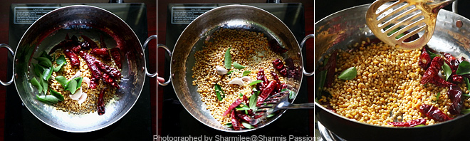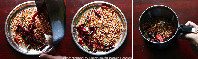 - To a heavy bottomed kadai all the ingredients listed under ‘To be roasted 1’, roast until golden.