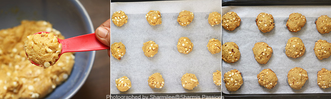 Now scoop the batter using a tbsp measure, scoop out on the butter paper lined in a baking tray.While doing this preheat oven at 160 deg C for 10 mins.Bake in preheated oven at 160 deg for 15 mins.