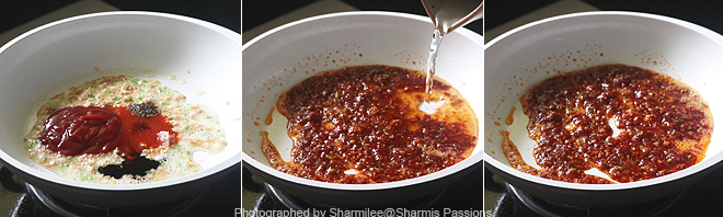 Add all the sauces along with salt,sugar and pepper powder mix well.Add 1/4 cup water mix it well and let the sauce boil fora minute.